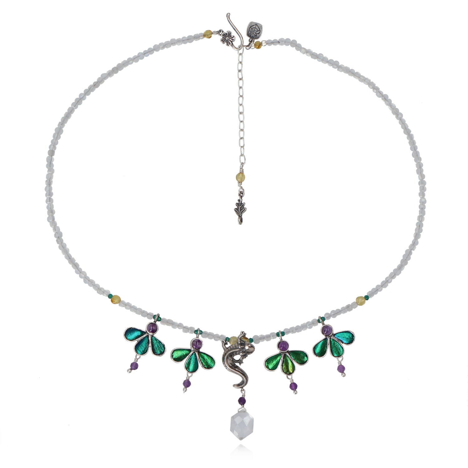 Piedra: Amarillo: Ámbar, Morado: Amatista, Verde: Cristal, Blanca: Piedra Luna, Trasparente: Cuarzo, Gotas Fluorescentes: Alas de Escarabajo naturales.