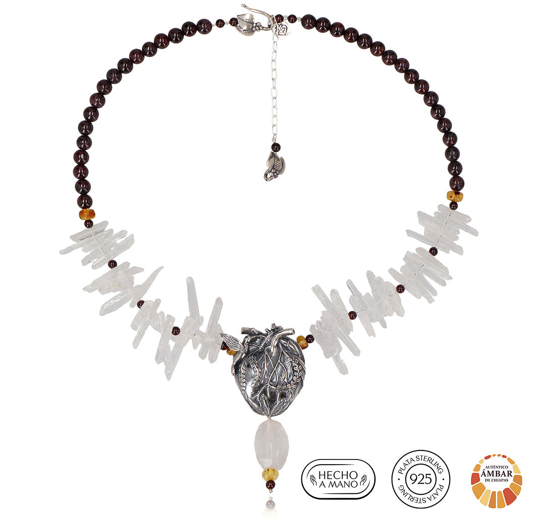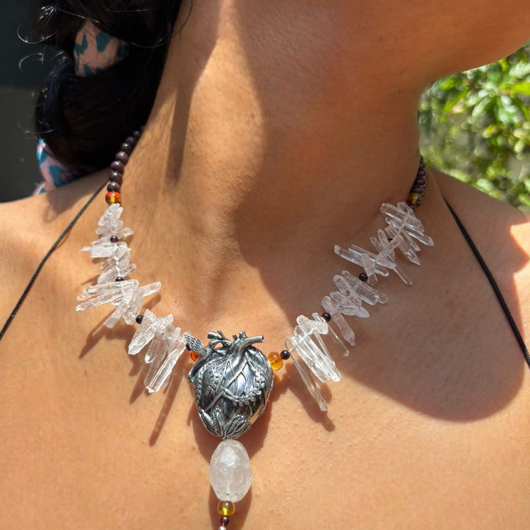Un corazón real, vivo, acompañado de colibríes que lo custodian. Este collar es un homenaje a la pasión, a la conexión profunda con lo que amas y a la fuerza vital que impulsa tus pasos. Llevarlo es recordar que tu corazón, como la tierra, tiene la capacidad de crear vida.