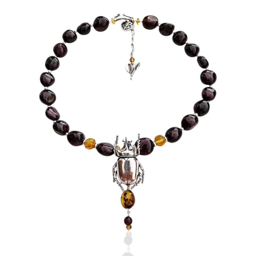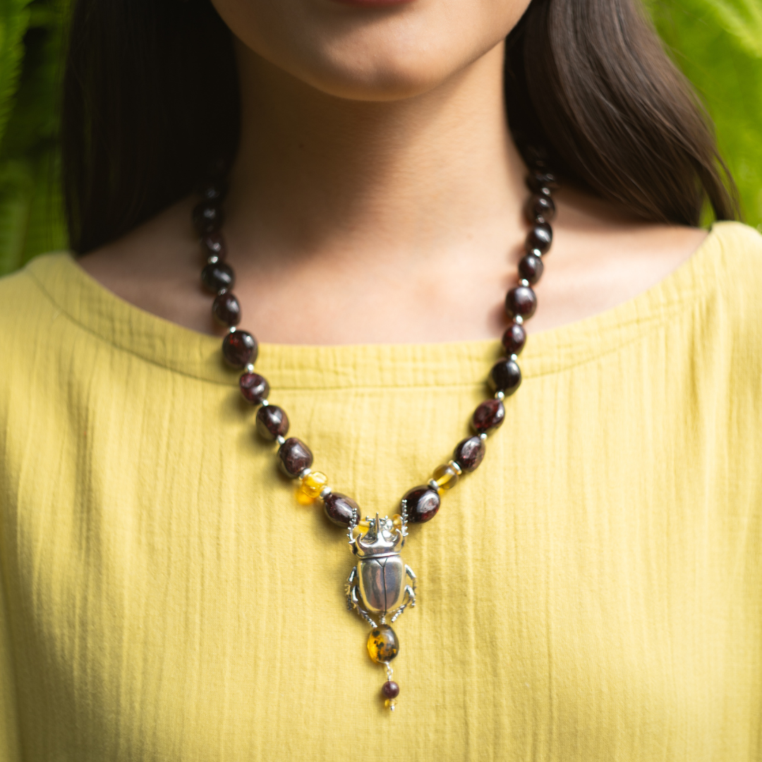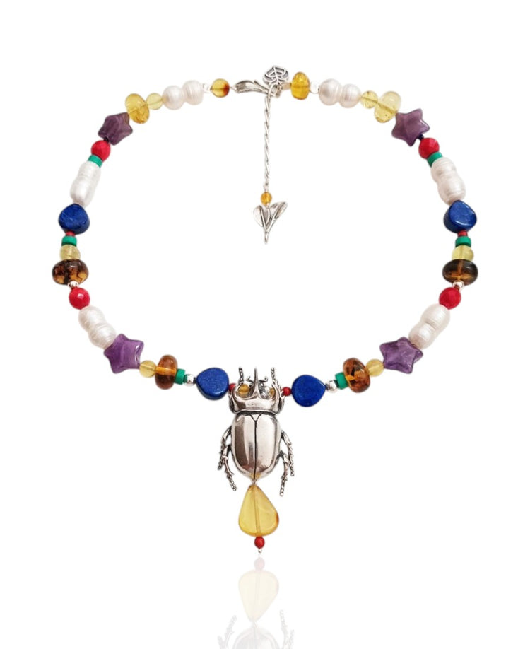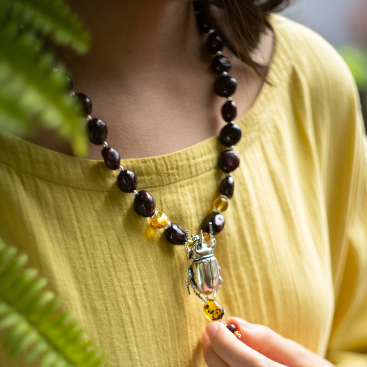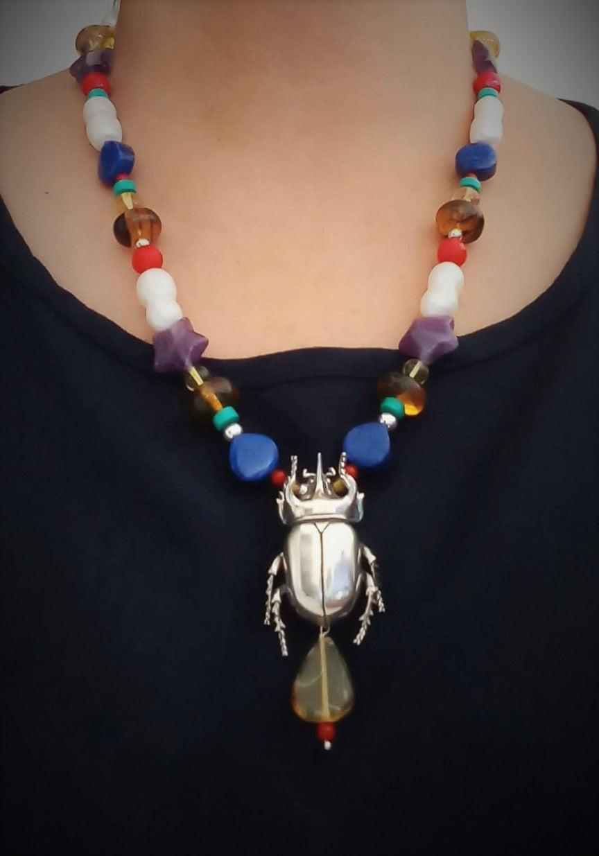 El poderoso escarabajo de la especie Stretegus nos regala su fuerza para tomar lo negativo de la vida y transmutar la energía en impulso personal. Este collar es una invitación a dejarnos envolver por las enseñanzas de los insectos.