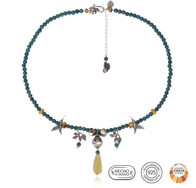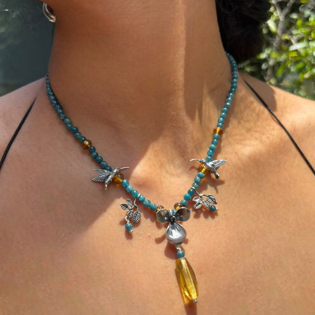 Inspirado en el azul profundo de las flores de añil y en el vuelo sagrado del colibrí, este collar guarda la esencia de los cielos infinitos. Es un amuleto para quienes encuentran paz en el movimiento y fuerza en la calma, como el cielo que se renueva cada día.