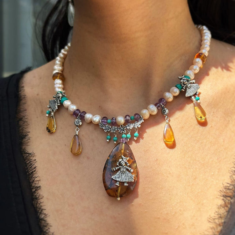 Piedras: Rosa: Perla Cultivada, Morado: Amatista, Azul: Turquesa, Amarillo: Ámbar.