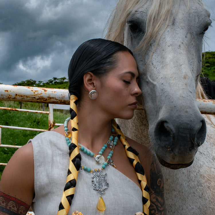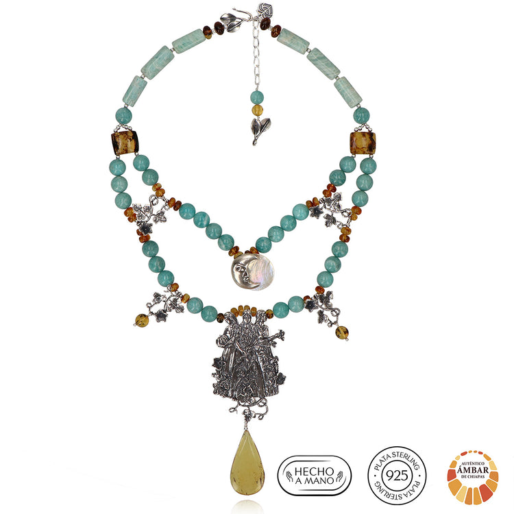 PIEDRAS: Azul: Amazonita, Amarillo: Ámbar.