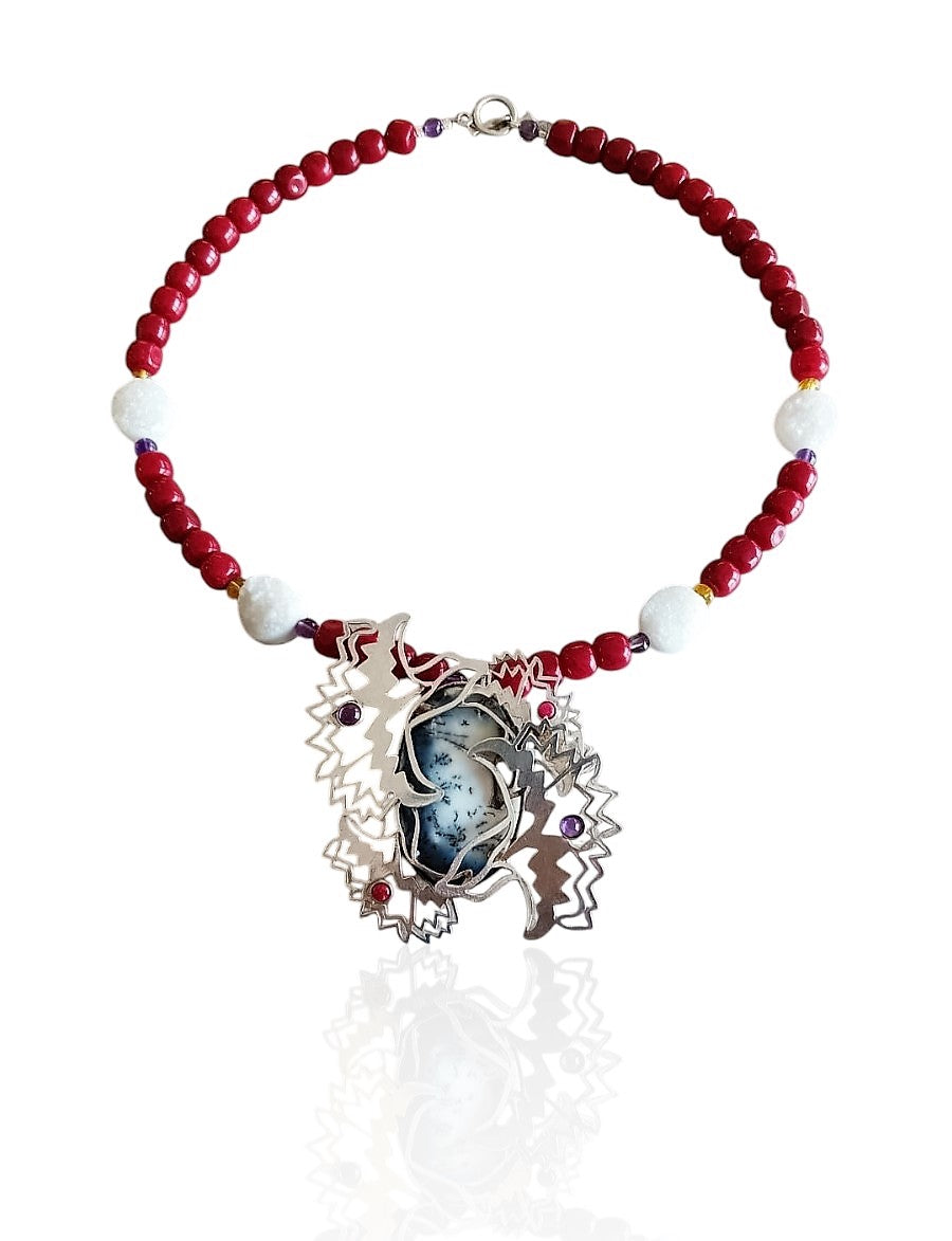 Piedra: Rojo: Coral, Blanca: Drusa, Morado: Amatista, Amarillo: Ámbar, Piedra Central: Ágata musgosa.