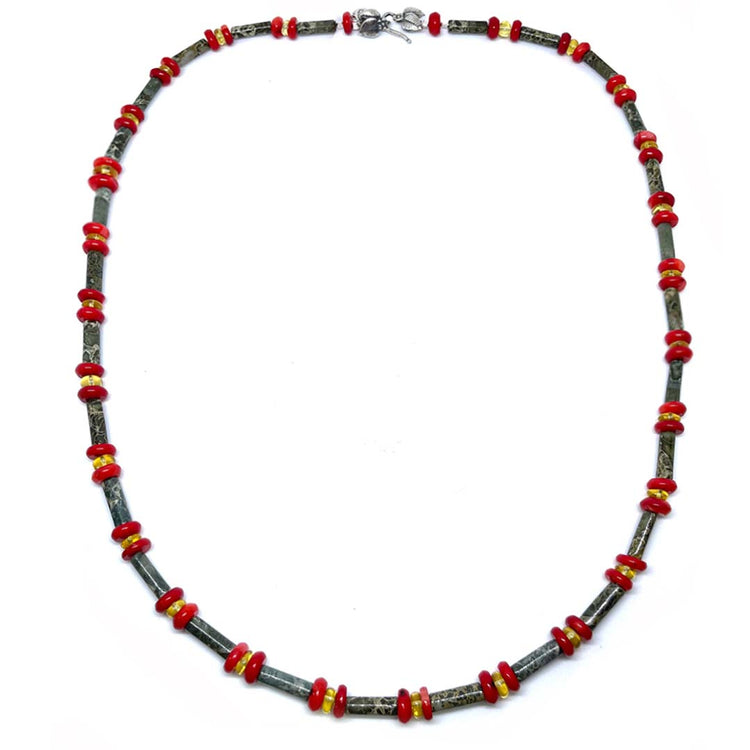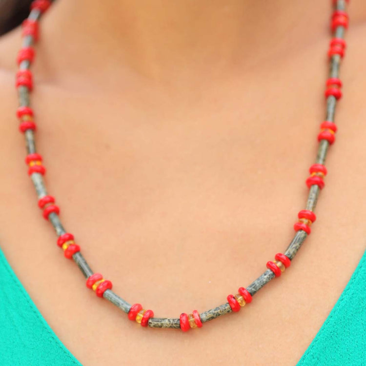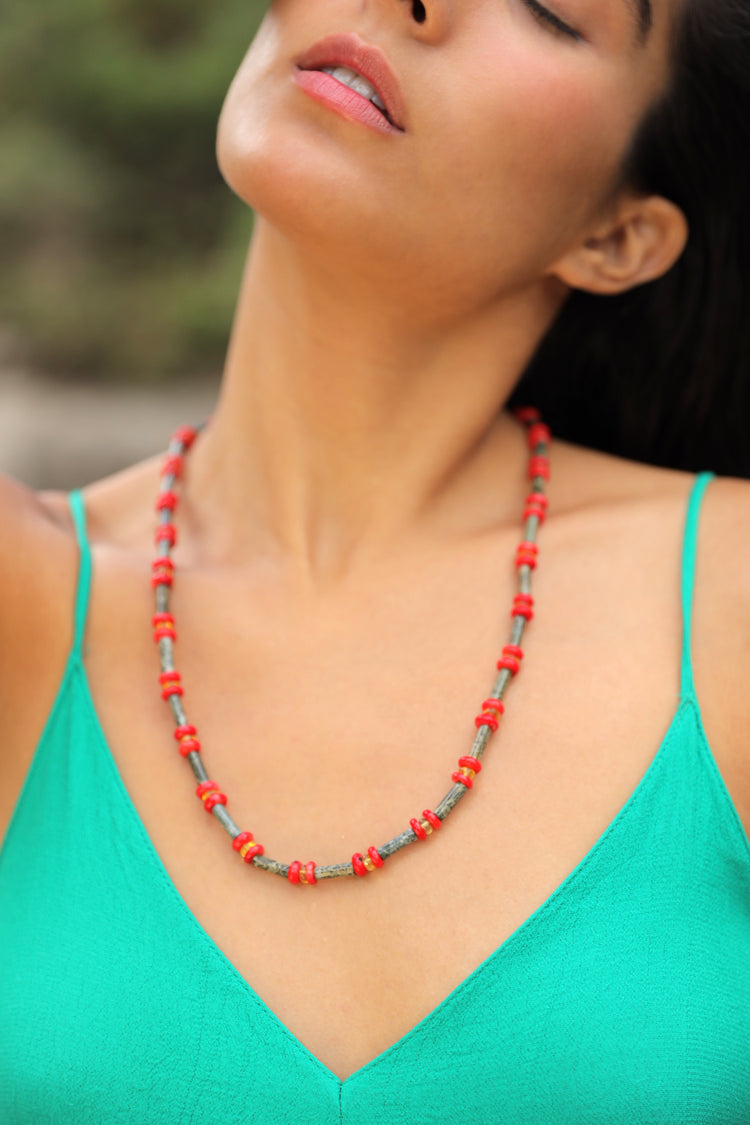 Este collar largo es una joya artesanal para mujer elaborada con plata ley .925, ámbar de Chiapas, coral y jaspe verde.