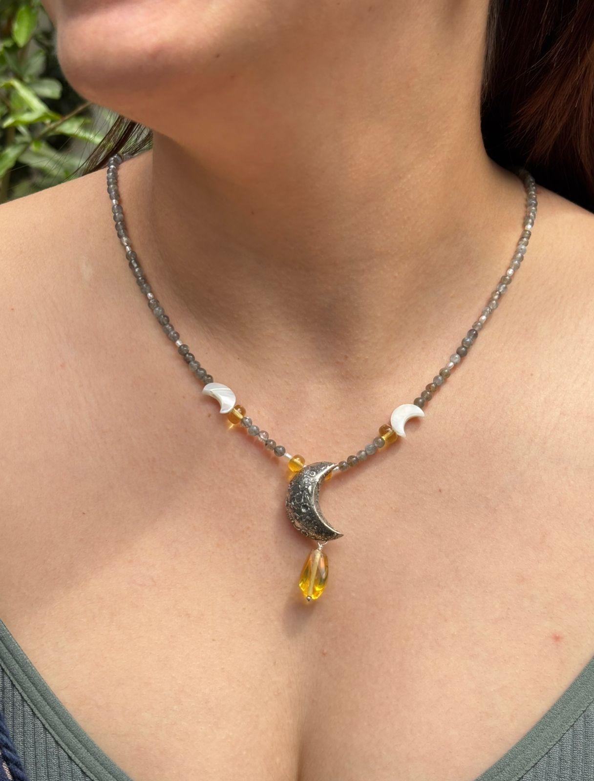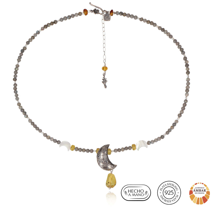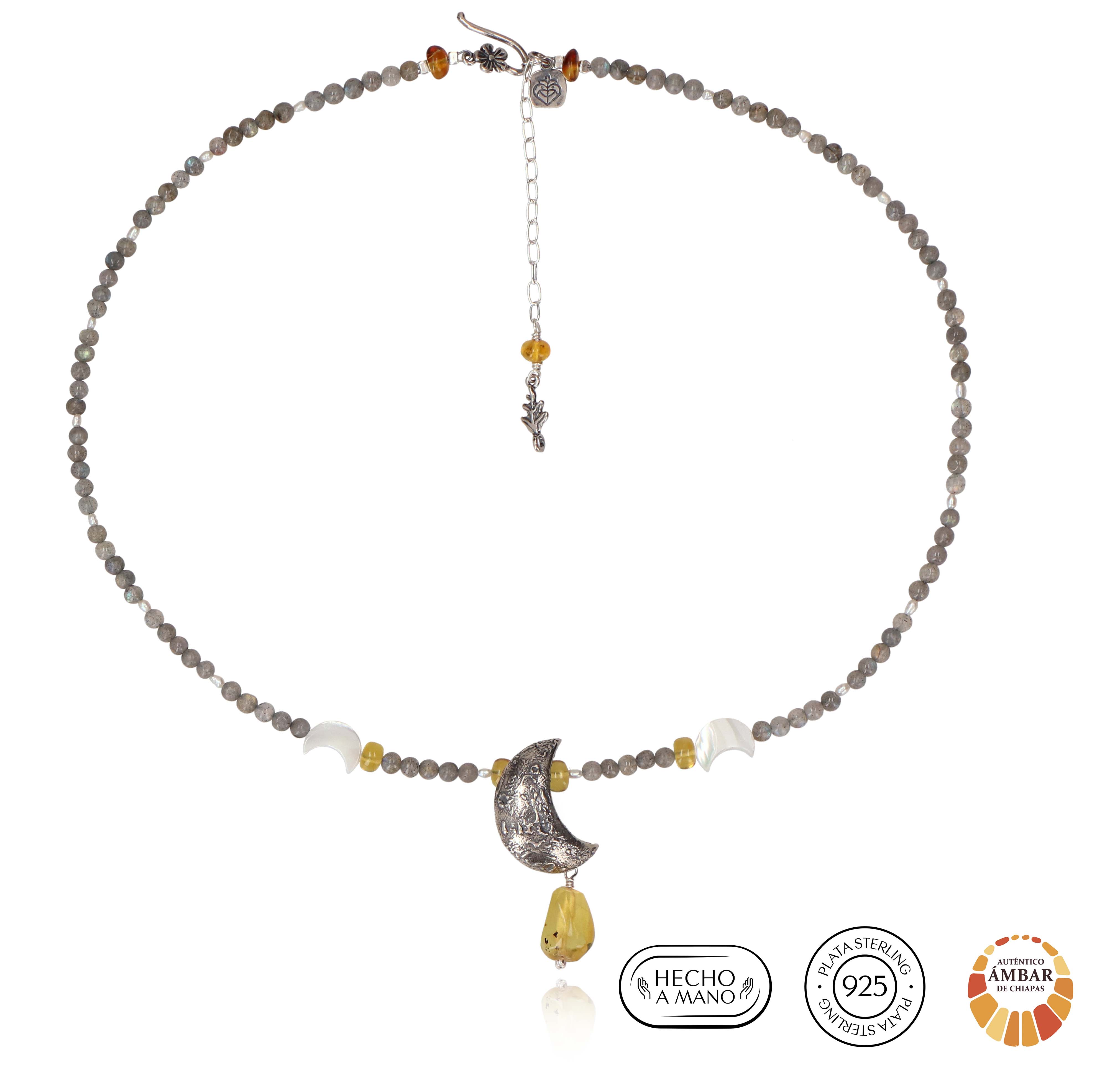 Piedras: Gris, Labradorita, Blanca: Concha Nácar, Amarillo: Ámbar.