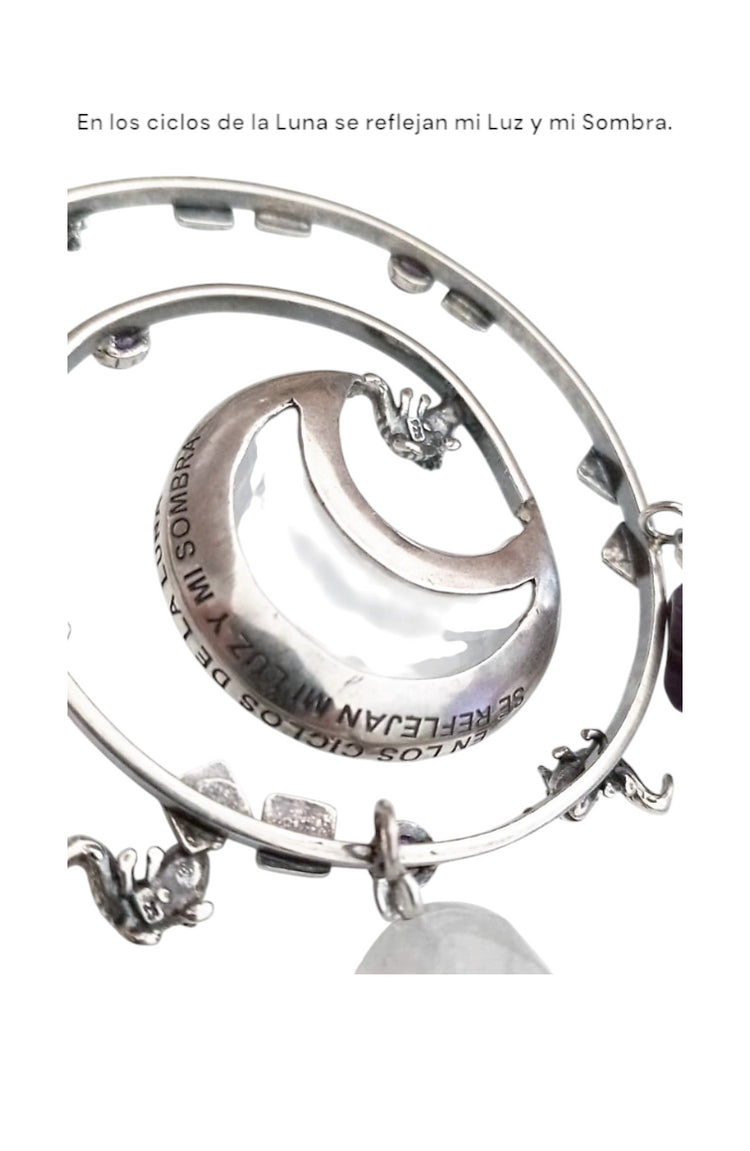 Este collar representa la magnitud del poder femenino, la grandeza del astro más cercano a la Tierra, que rige lo que sentimos y la memoria de lo vivido. La luna conecta con el agua, que mueve nuestras mareas emocionales aquellas fincadas desde la niñez.