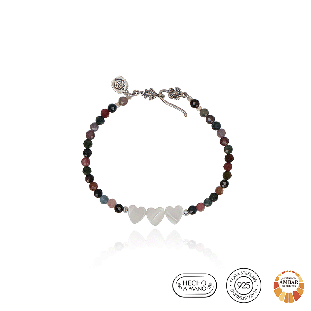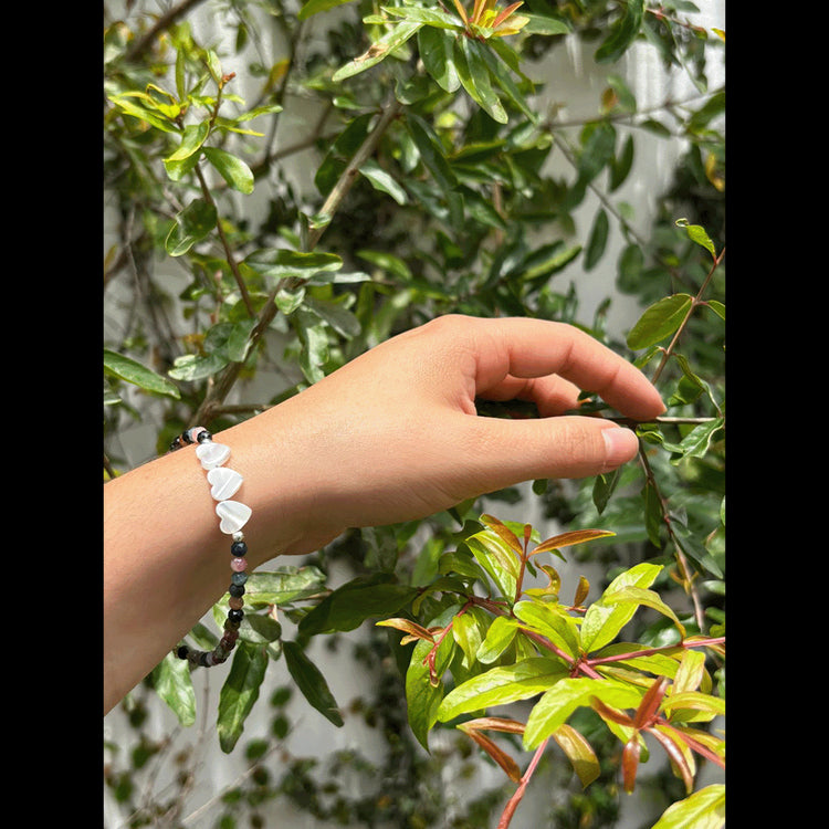 Esta pulsera protege y nutre al corazón. La turmalina protege, el nácar aporta luz y los corazones celebran el amor en todas sus formas. Es un escudo suave y luminoso que recuerda que el amor propio siempre debe ser el centro.