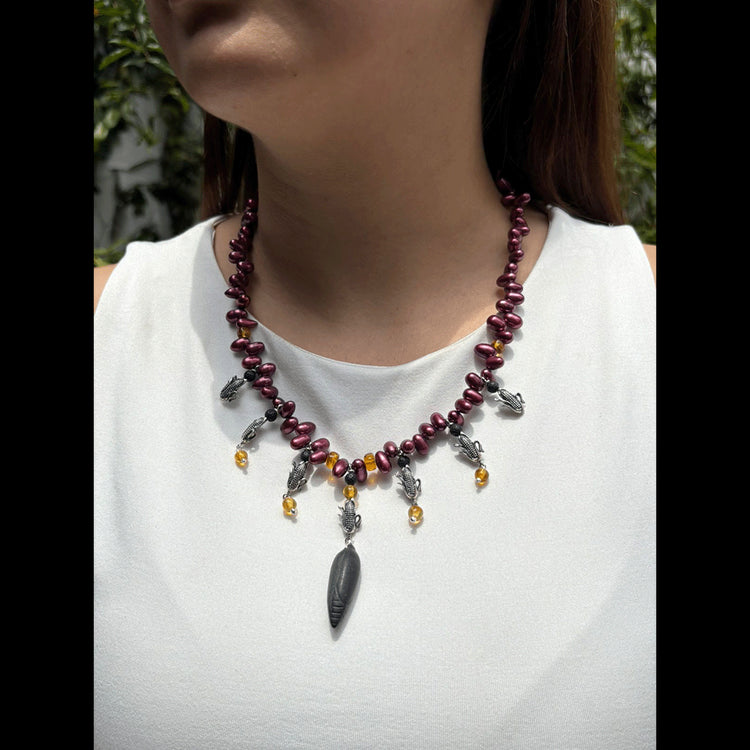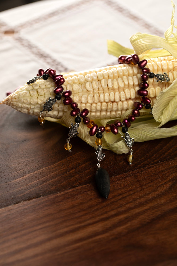 El maíz, corazón de nuestra raíz mexicana, se une al ámbar y la perla para celebrar la abundancia y la vida. Esta pieza es un canto a la gratitud: al portarla llevas contigo la riqueza de la tierra y el fruto de tu esfuerzo.