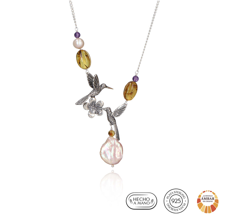 MEDIDAS: Largo 54 cm, Dije 5.5 cm Piedras: Blanca: Perla Cultivada, Amarillo: Ámbar, Morado: Amatista. Diseños hechos de plata mexicana .925. Usted está adquiriendo un producto natural, por lo que los colores y formas de las piedras y algunos materiales pueden variar, estos componentes de nuestras joyas están sujetos a disponibilidad. Agradecemos su comprensión. Las fotografías con piedras de otros colores o más de un artículo son meramente ilustrativas.