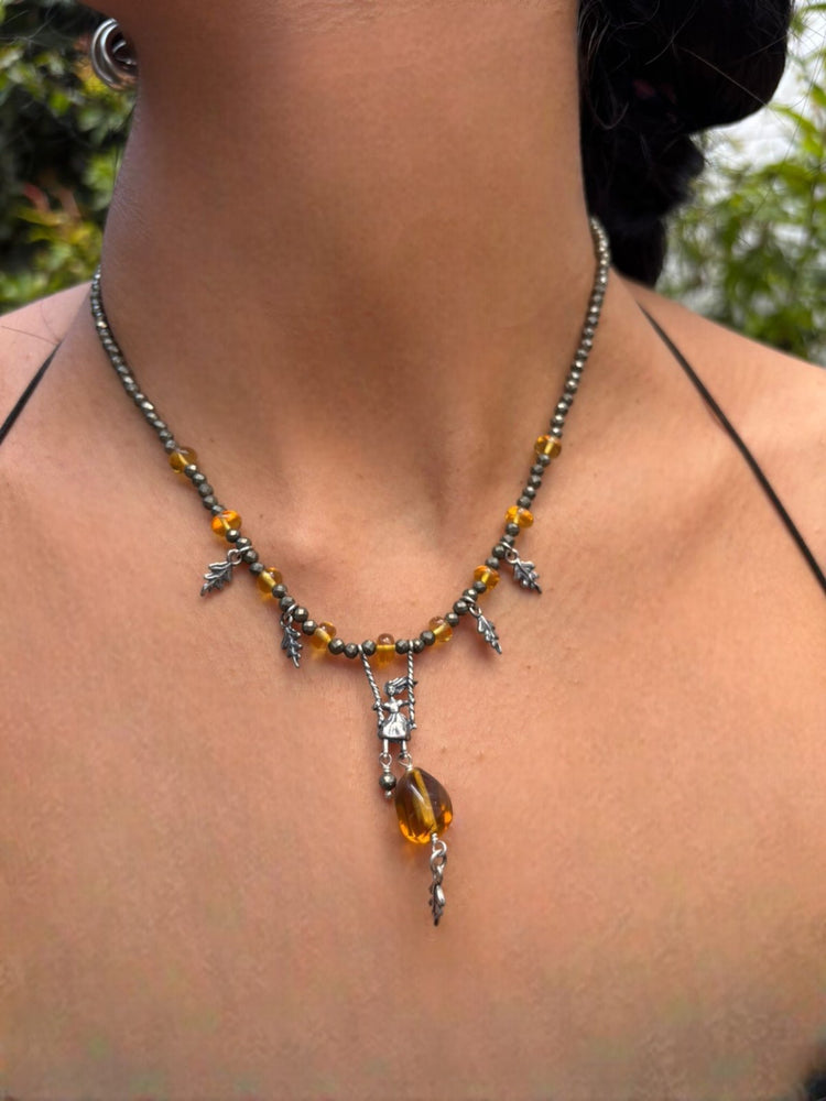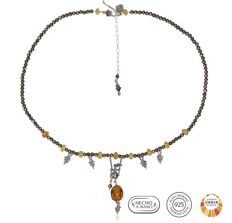 MEDIDAS: Largo 46 cm, Dije 5,5 cm, Extensión 5 cm. Piedras: Pirita, Amarillo: Ámbar.