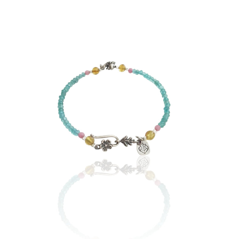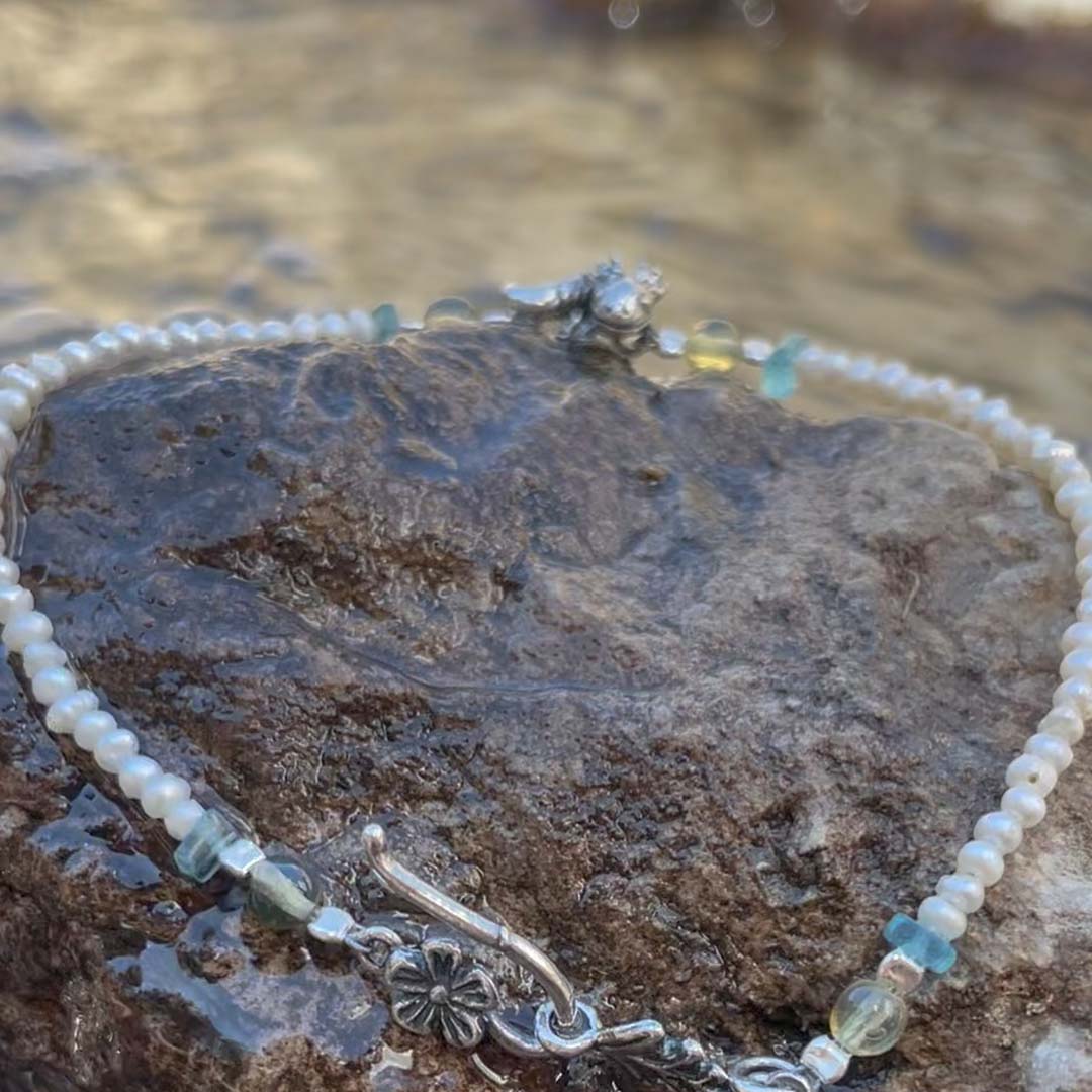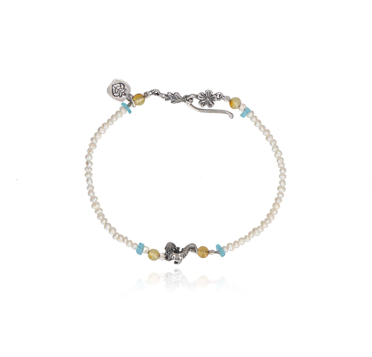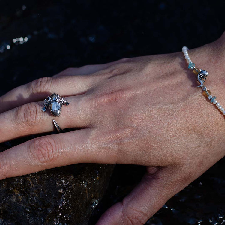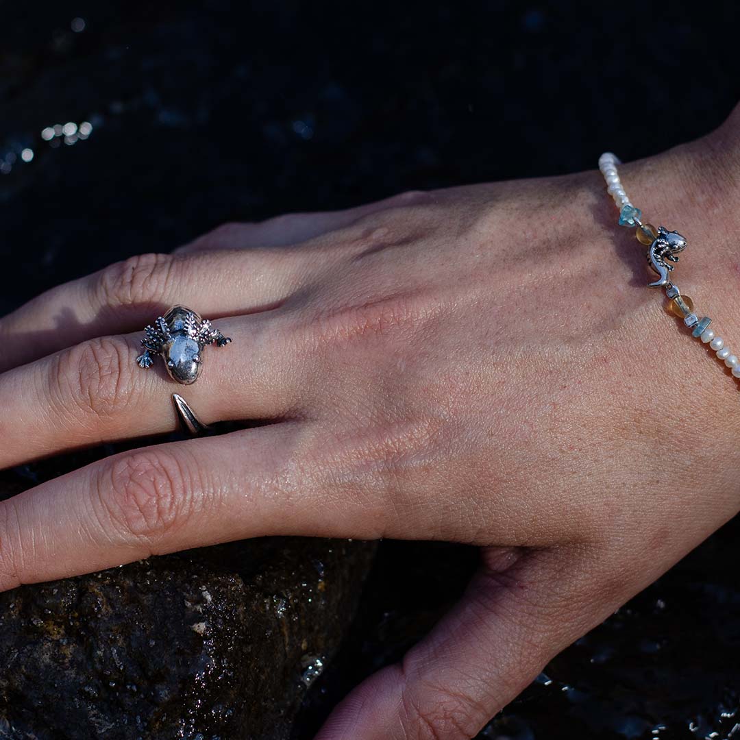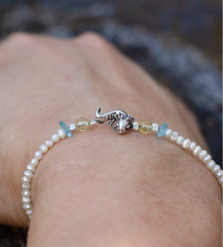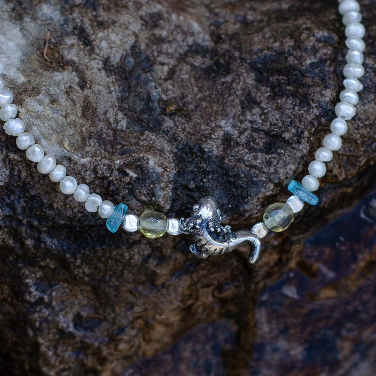 Esta pulsera es una joya artesanal para mujer elaborada con plata ley .925, perlas de río, y piedra natural de apatita. El Ajolote es una salamandra con la característica poco habitual de conservar sus rasgos larvales en su vida adulta. Esta condición, que se conoce como neotenia, significa que conserva su aleta dorsal de renacuajo -que recorre casi la totalidad de su cuerpo- y sus branquias externas, que sobresalen de la parte trasera de su ancha cabeza en forma de plumas. Esto lo lleva a que difiere de la mayoría de las salamandras en que vive permanentemente en el agua. Representa la renovación y la capacidad de recontruirse después de una perdida.