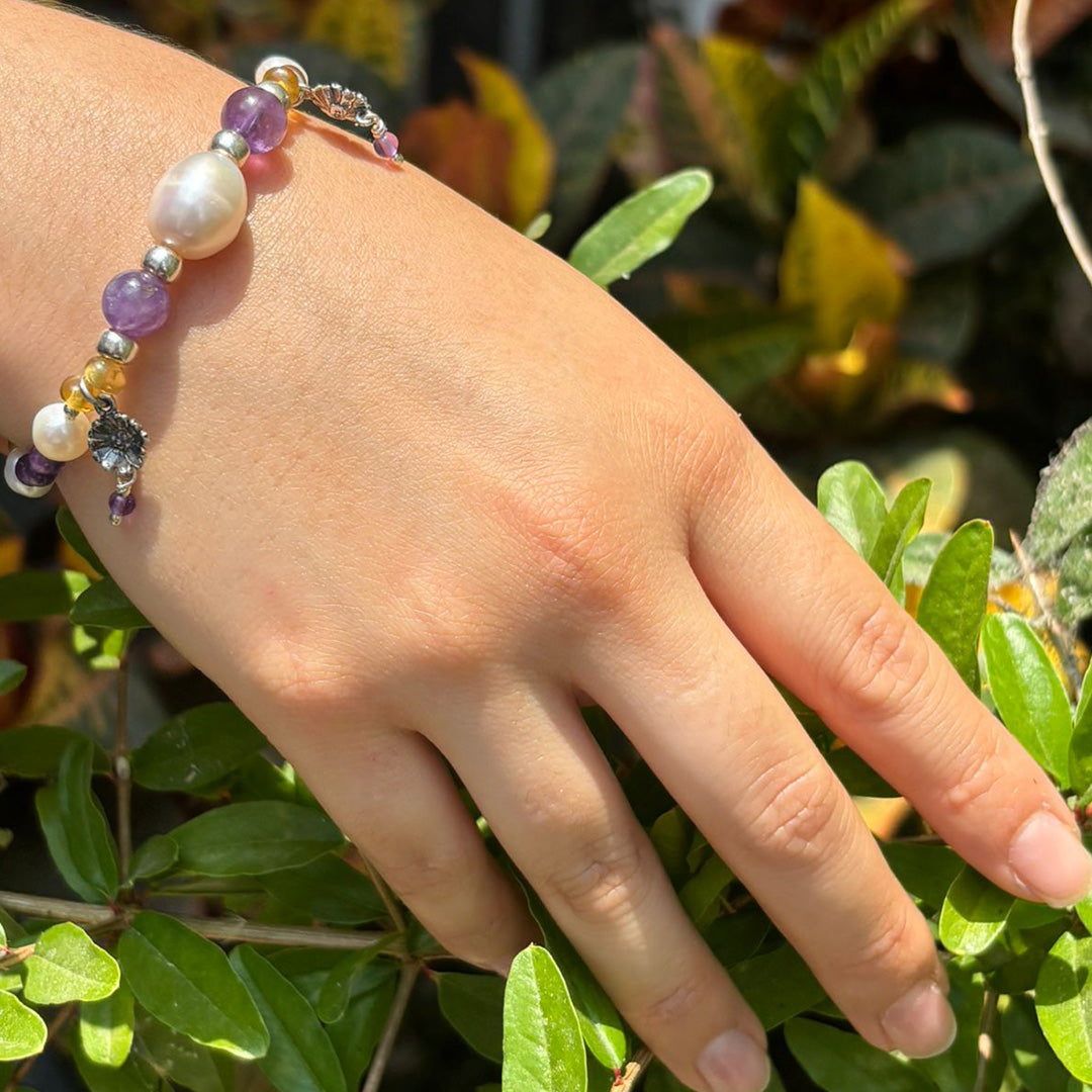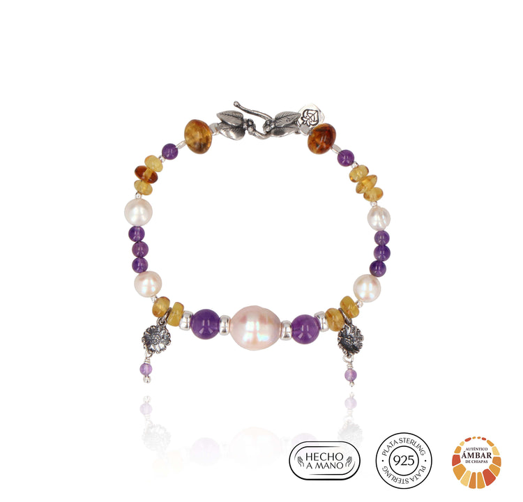 MEDIDAS: 19 cm Largo, Dije 2 cm. Piedras: Blanca: Perla cultivada, Morado: Amatista, Amarillo: Ámbar. Diseños hechos de plata mexicana .925. Usted está adquiriendo un producto natural, por lo que los colores y formas de las piedras y algunos materiales pueden variar, estos componentes de nuestras joyas están sujetos a disponibilidad. Agradecemos su comprensión. Las fotografías con piedras de otros colores o más de un artículo son meramente ilustrativas.