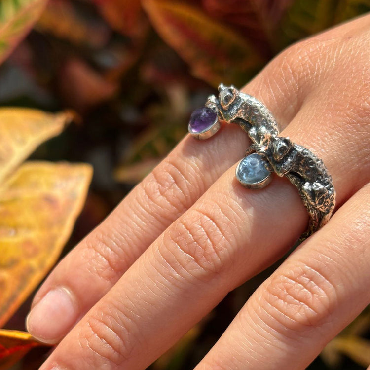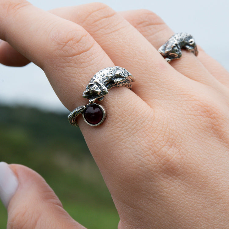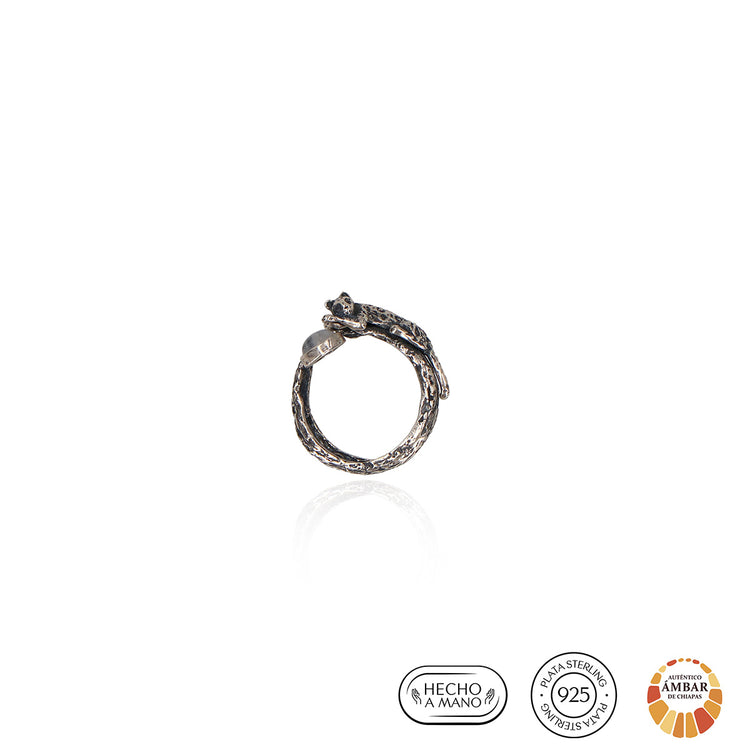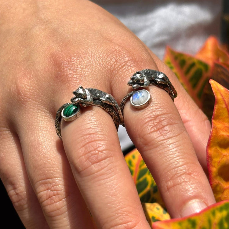 Jaguar en plata .925 sobre rama natural y malaquita verde. Talismán de fuerza serena y visión activa. La malaquita transforma, enraíza y equilibra. El jaguar guía en silencio, resguardando el crecimiento interior.