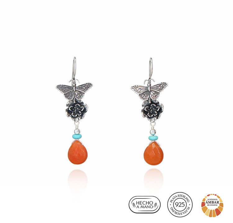 Estos aretes honra el vuelo de las mariposas monarca que, como las almas en Día de Muertos, regresan guiadas por la luz del cempasúchil. La turquesa, piedra de protección y serenidad, simboliza ese puente sagrado entre lo terrenal y lo divino.