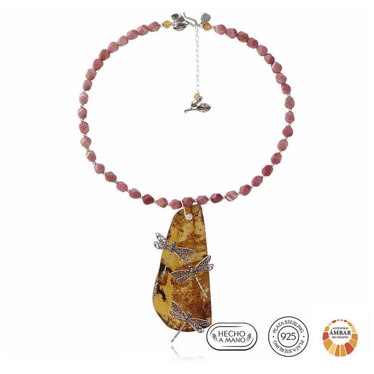 MEDIDAS: Largo 47 cm, Dije 10.7 cm, Extension 5 cm. Piedras: Amarillo: Ámbar, Rosa: Rodocrosita. Diseños hechos de plata mexicana .925. Usted está adquiriendo un producto natural, por lo que los colores y formas de las piedras y algunos materiales pueden variar, estos componentes de nuestras joyas están sujetos a disponibilidad. Agradecemos su comprensión. Las fotografías con piedras de otros colores o más de un artículo son meramente ilustrativas.