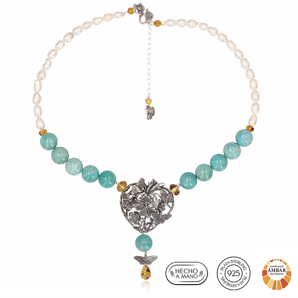 MEDIDAS: Largo 47 cm, Dije 7,5 cm, Extensión 5 cm. Piedras: Blanco: Perla, Azul: Amazonita, Amarillo: Ámbar. Diseños hechos de plata mexicana .925. Usted está adquiriendo un producto natural, por lo que los colores y formas de las piedras y algunos materiales pueden variar, estos componentes de nuestras joyas están sujetos a disponibilidad. Agradecemos su comprensión. Las fotografías con piedras de otros colores o más de un artículo son meramente ilustrativas.