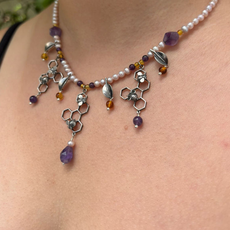 Piedras: Rosa: Perla cultivada, Morado: Amatista, Amarillo: Ámbar.