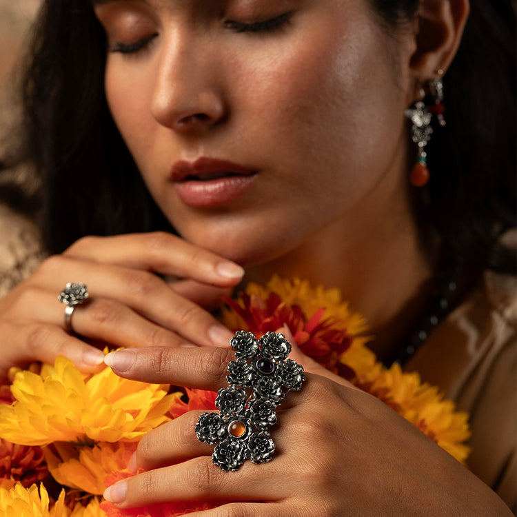 Este anillo simboliza la creencia de que los petalos de esta flor de cempasúchil guia a las almas de regreso a su hogar, para recordarte que siempre estaran vivos en tu corazón