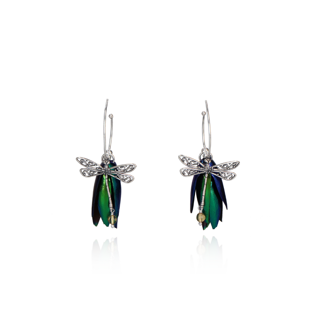 La libélula, acompañada de hipnotizantes alas de escarabajo, se convierte en un talismán de reflexión, conciencia y libertad, que acompaña tu viaje de transformación y crecimiento constante hacia un ser más conectado con el infinito poder de la biodiversidad del planeta.