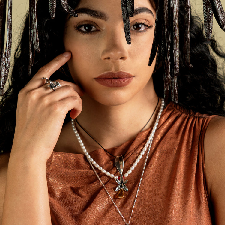 En su ambiente natural, en los húmedos bosques de Veracruz, las hojas de la vainilla logran capturar la atención al colgar de los grandes árboles. Las traemos a este dije como elemento icónico para quien decide lucirlos.