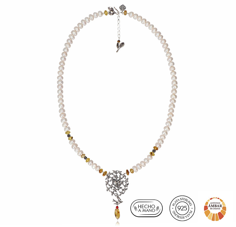 Collar largo en plata .925, perlas naturales, ámbar de Chiapas. Una parvada de golondrinas con un centro de corazón como símbolo de búsqueda compartida. Esta joya representa el impulso de volver al origen después del movimiento: el centro energético como espacio de cuidado, memoria y pertenencia. Un recordatorio de que regresar al corazón es también regresar a lo que nos da sentido.