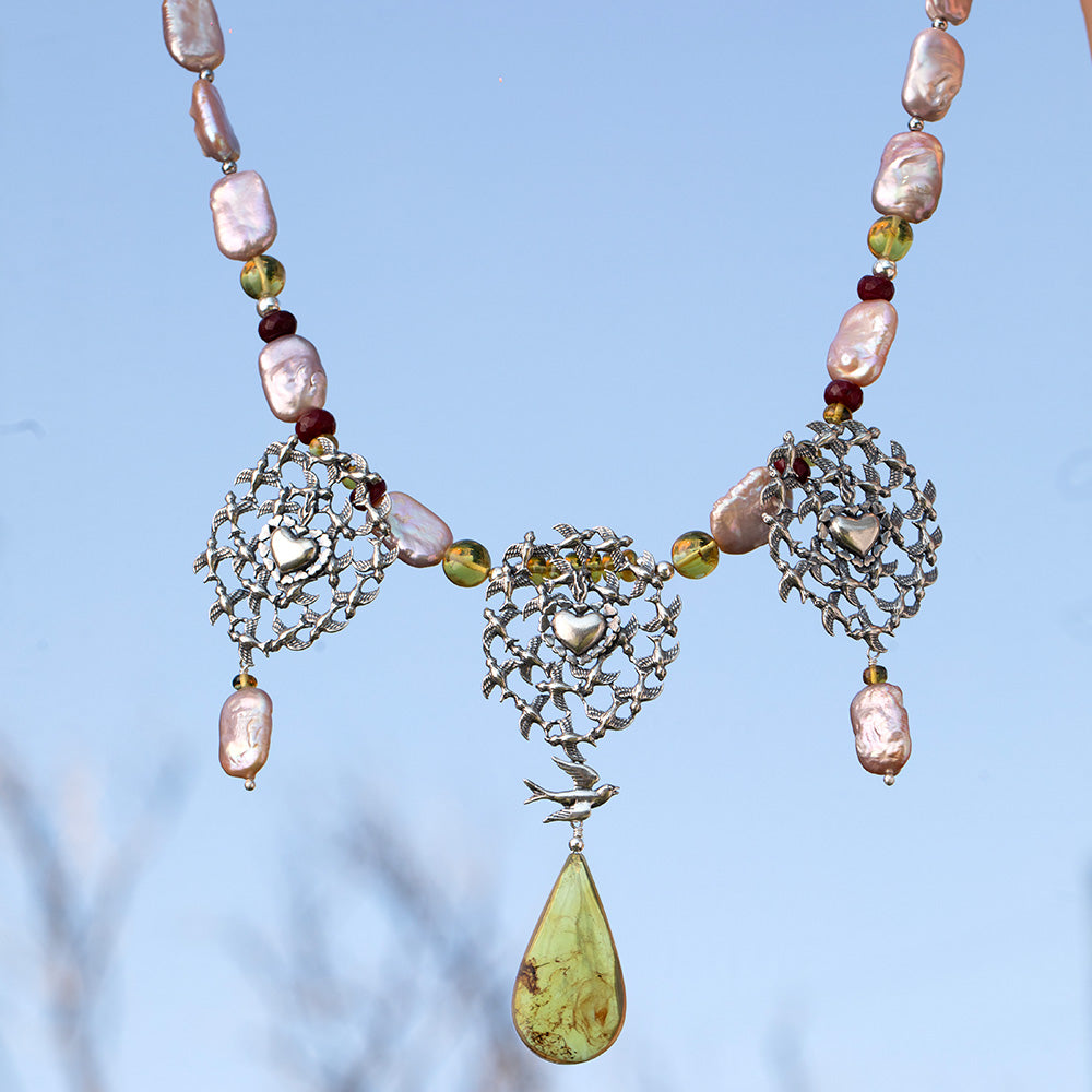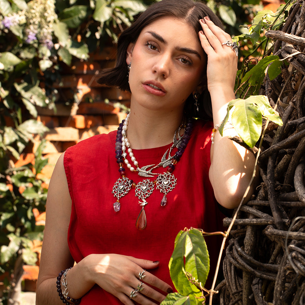 Con tres parvadas de golondrinas danzando en el aire, corazones al centro y una golondrina individual como ancla de identidad. La amatista eleva la conciencia y el ámbar guarda la memoria del amor vivido. Talismán de pertenencia consciente y libertad interior.