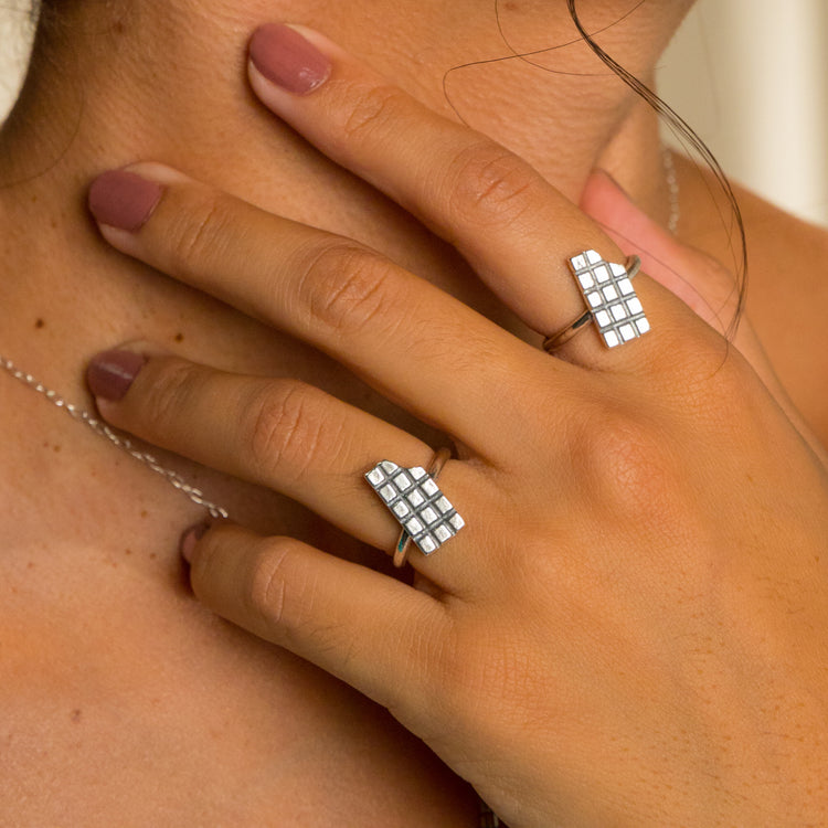 This adjustable ring is a handmade piece of jewelry for women made from .925 sterling silver. In this piece we can see a chocolate bar. Chocolate is obtained by mixing sugar, paste and cocoa butter.