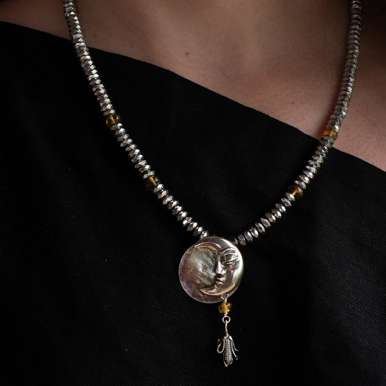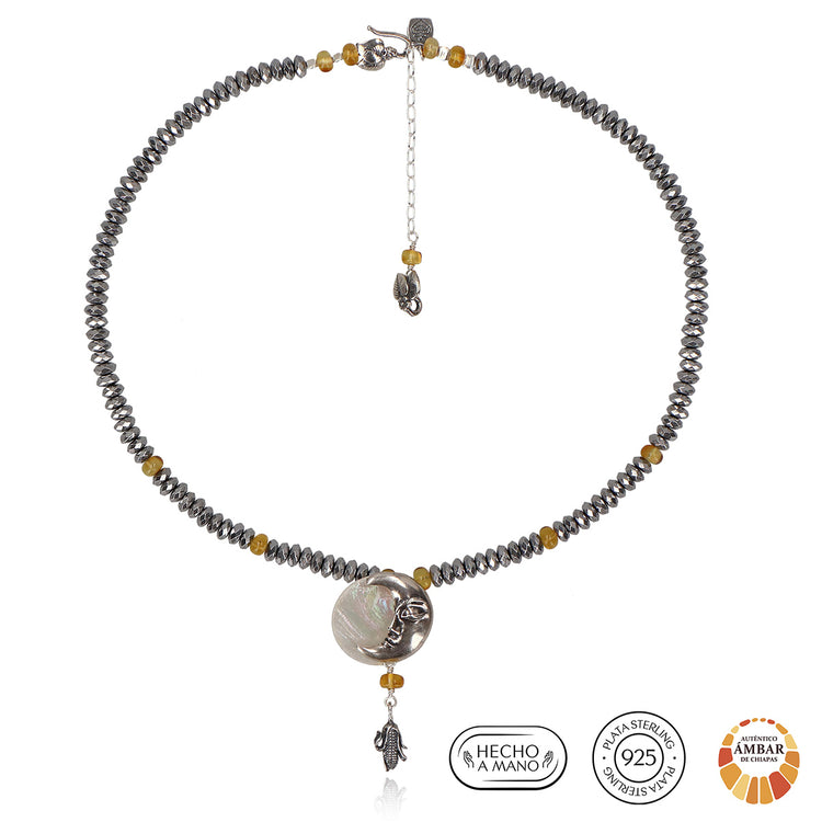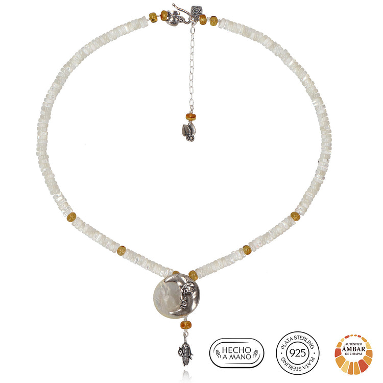 Concha natural y mazorca mini en plata .925: la luna guía ciclos, el maíz sostiene la vida. Collar talismán de resguardo y sustento para honrar raíces y procesos que florecen.