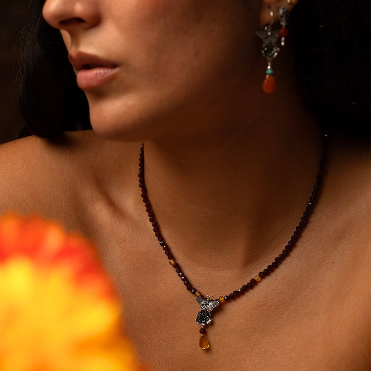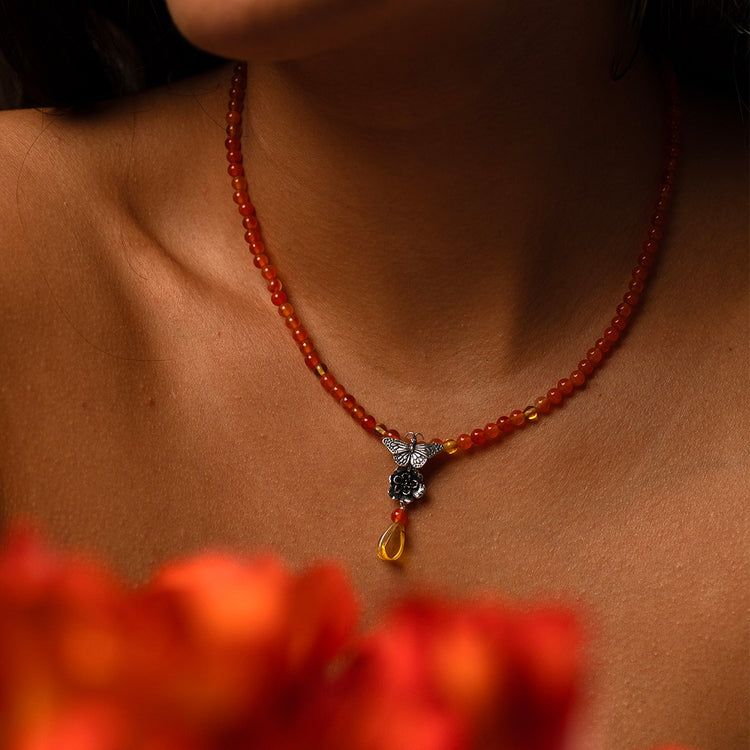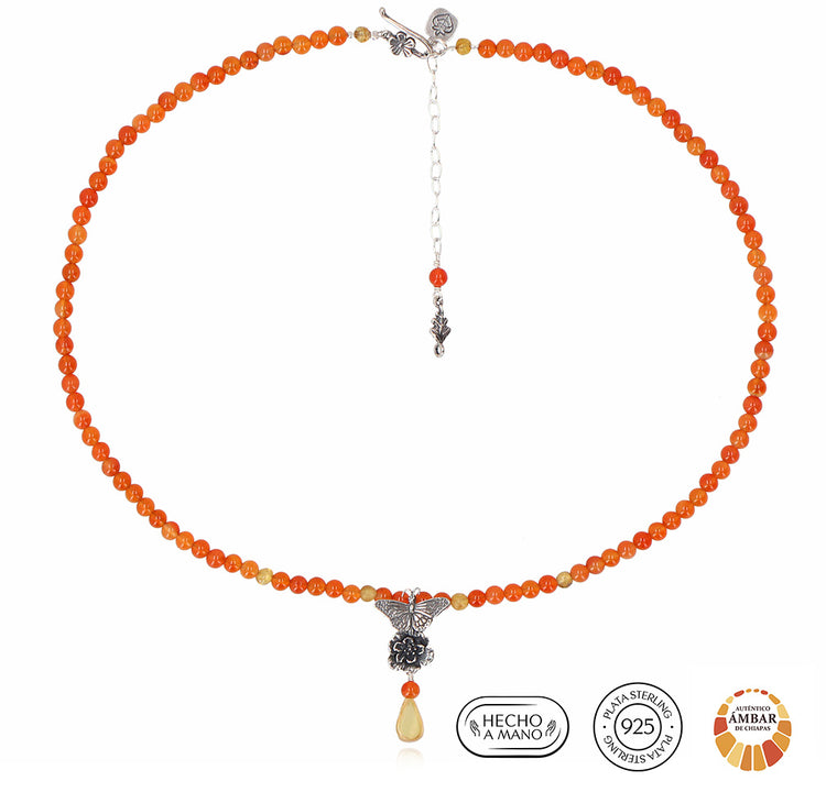 Este collar como un altar en miniatura, reúne los colores y la energía de la tradición, Inspirado en la flor de cempasúchil, símbolo de vida y de eternidad, este diseño celebra la belleza de lo efímero y la permanencia del recuerdo.