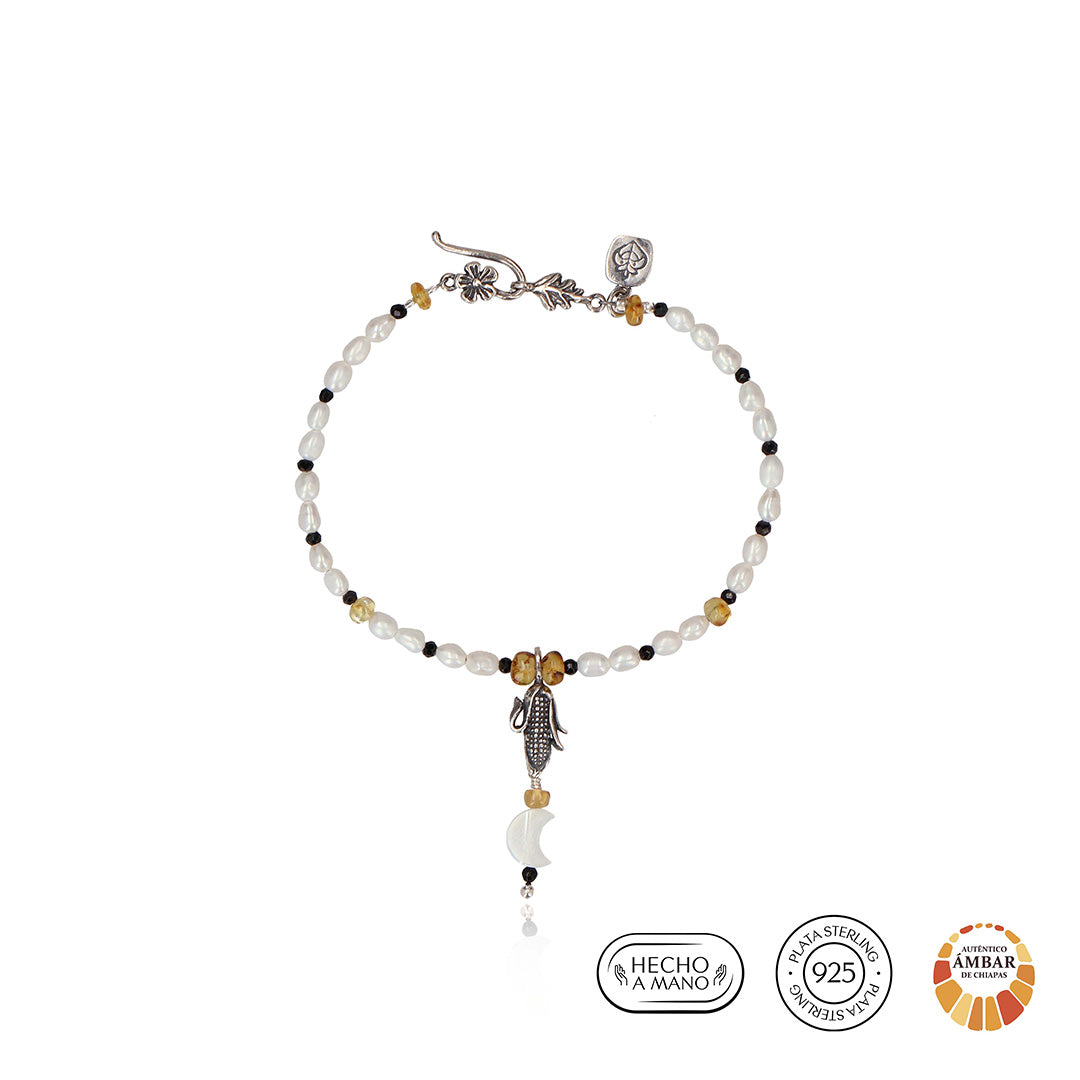 Piedras: Blanca: Concha nácar, Negra: Ónix, Amarillo: Ámbar.