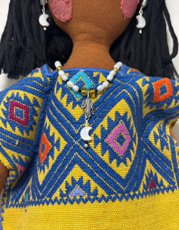 Estoy inspirada en ese grano sagrado del que, según el Popol Vuh, los humanos fuimos creados por los dioses mayas. Estoy aquí para recordarte que somos hechos del mismo grano, y que este origen compartido, nos hermana en la vida. Soy la conexión viva con la tierra, con la sabiduría de los pueblos originarios y con la memoria de nuestras abuelas.
