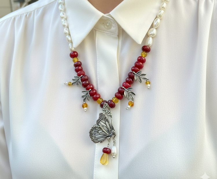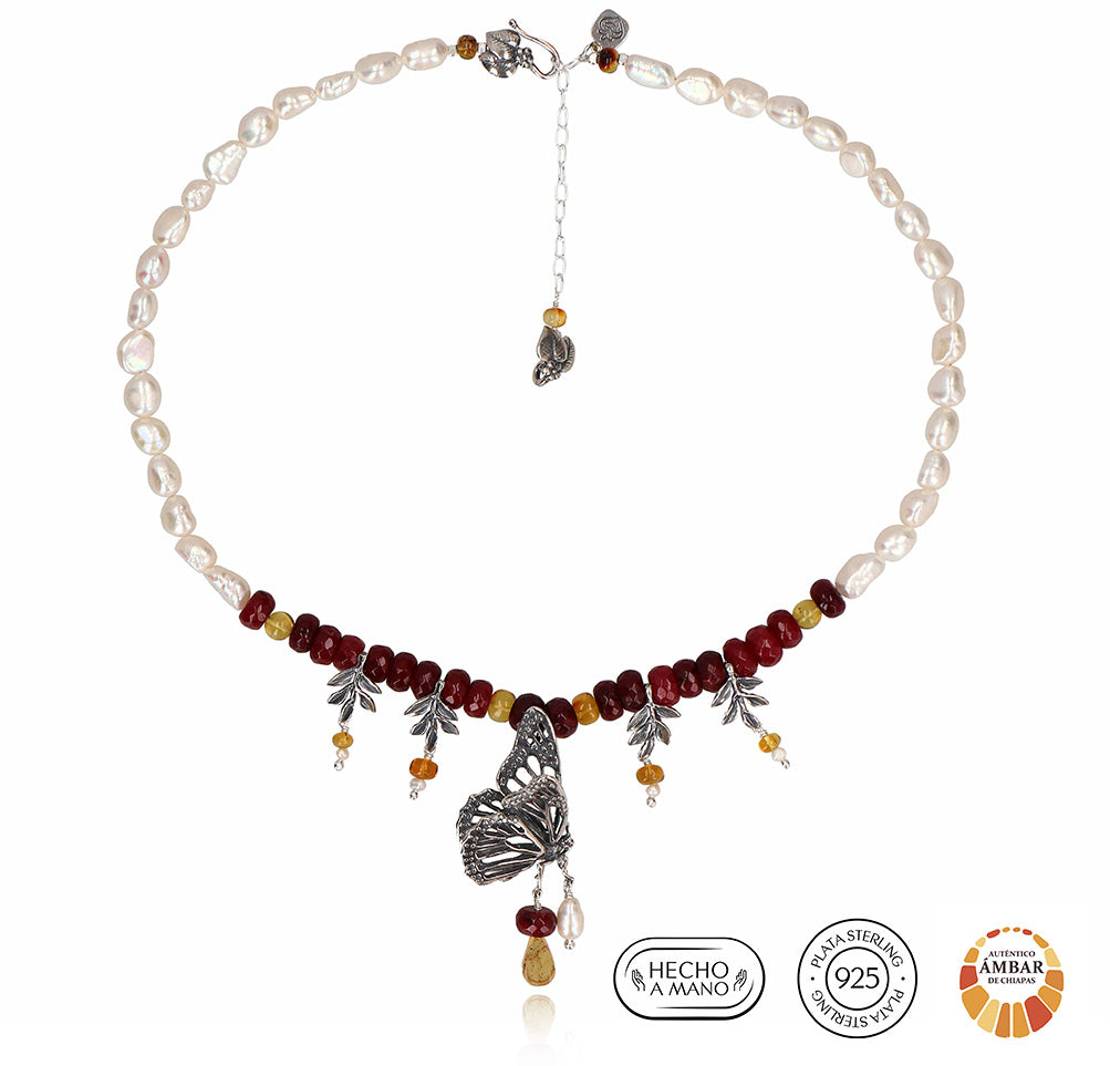 Inspirado en el viaje de la mariposa monarca, este collar habla de migración, propósito y regreso al origen. El ámbar conserva la energía del tiempo, la perla simboliza experiencia y el ágata roja impulsa la fuerza interior. Una pieza para quienes confían en su camino.