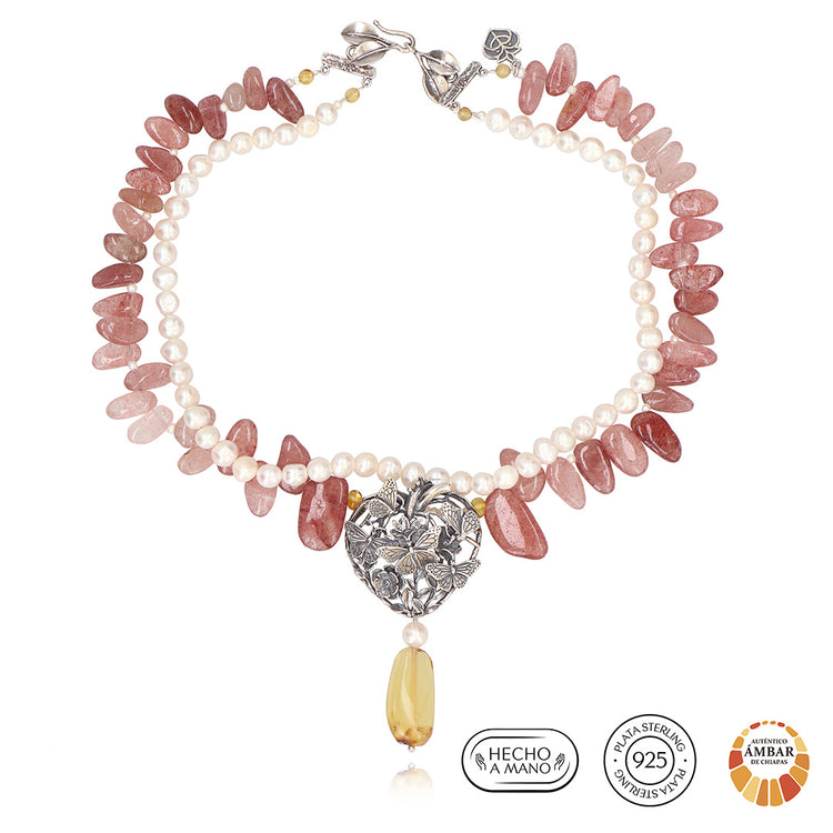 MEDIDAS: Largo 45 cm, Dije 7.5 cm, Extensión 5 cm. Piedras: Rosa: Cuarzo Cherry, Blanca: Perla cultivada, Amarillo: Ámbar. Diseños hechos de plata mexicana .925. Usted está adquiriendo un producto natural, por lo que los colores y formas de las piedras y algunos materiales pueden variar, estos componentes de nuestras joyas están sujetos a disponibilidad. Agradecemos su comprensión. Las fotografías con piedras de otros colores o más de un artículo son meramente ilustrativas.