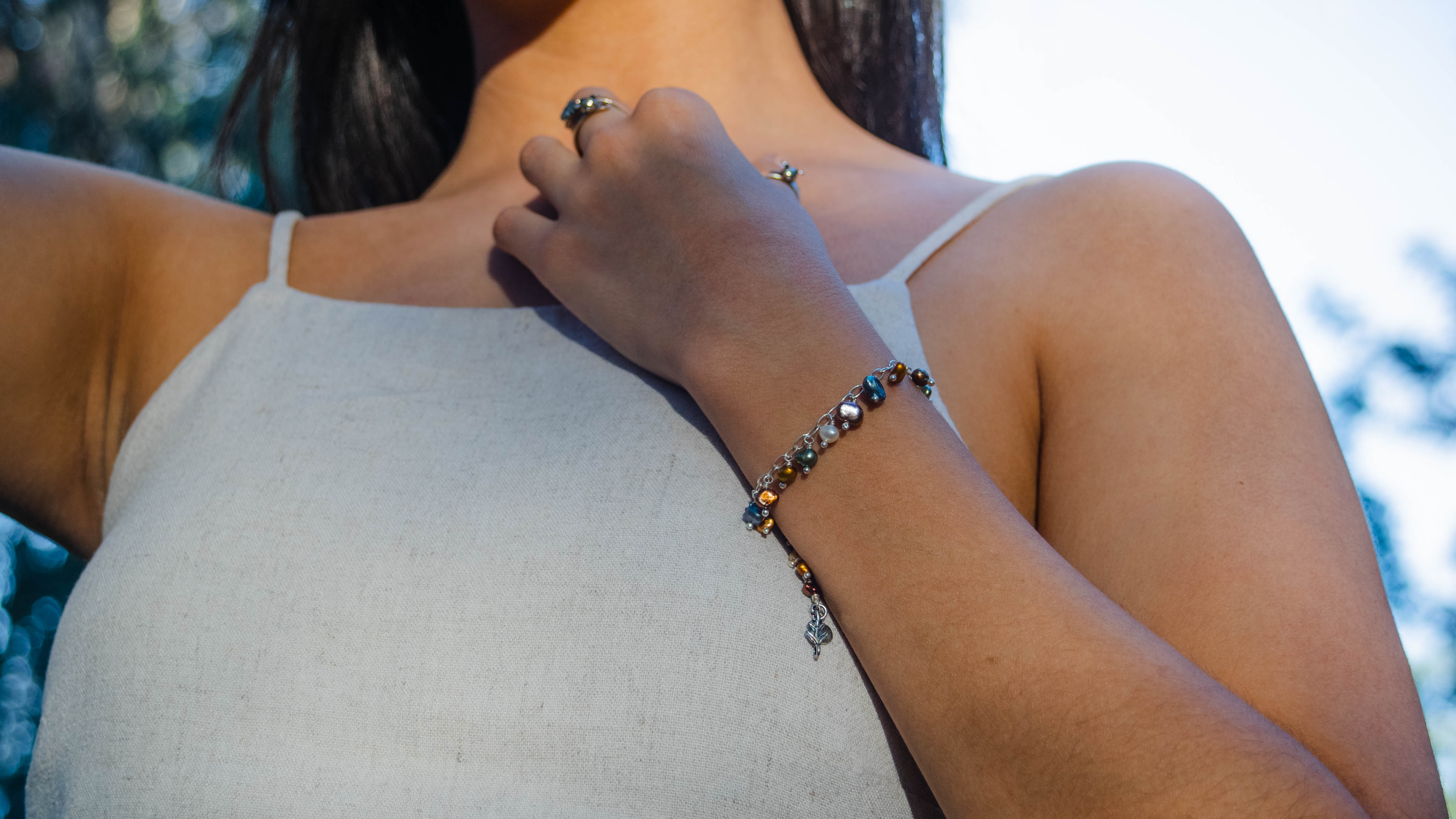This bracelet is a handmade jewel for women made with .925 sterling silver, measuring 21 cm long with pearls, it is specifically oriented towards the goddesses of the sea, it is also associated with the goddesses of the sky. Esoterically, they are attributed with properties of attracting fortune to those who possess them, in addition to attracting happiness and good energies.