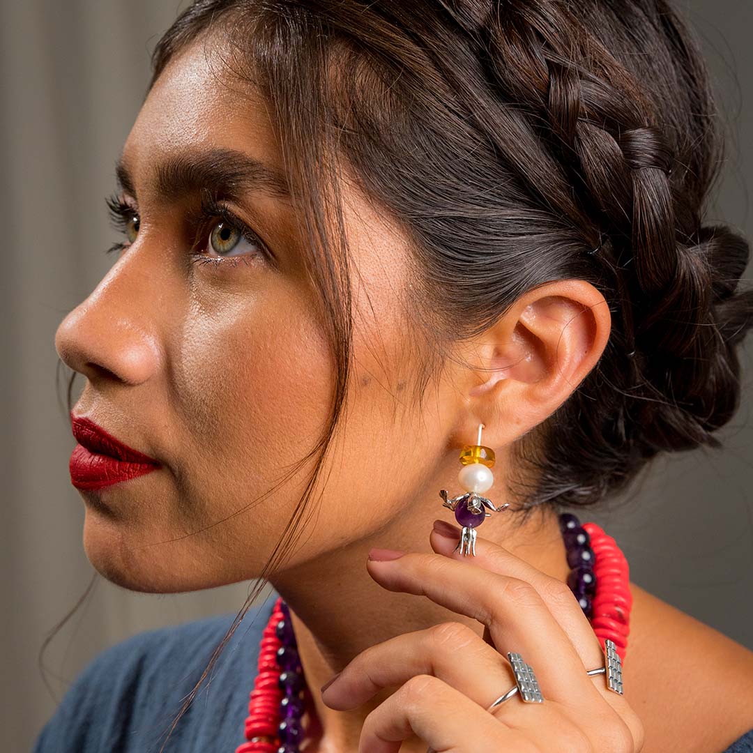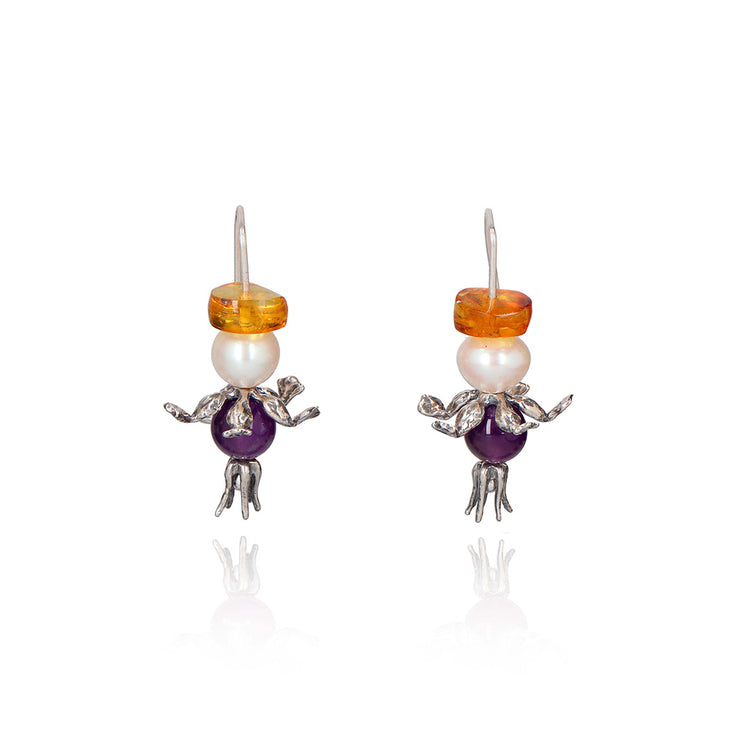 These earrings are a handmade jewelry for women made with .925 sterling silver, Chiapas amber, river pearl and amethyst. This is the flower of the Cacao, the cacao tree takes between 3 to 5 years to develop before it begins to bear fruit. Each mature cacao tree produces around 1000 seeds a year, enough to make 1 kilo of chocolate.