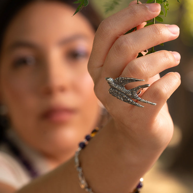 Anillo plata .925 en forma de golondrina. Esta joya acompaña el movimiento natural del cuerpo desde las manos, como una danza interna que sucede sin pensarlo y abraza la libertad del cuerpo.