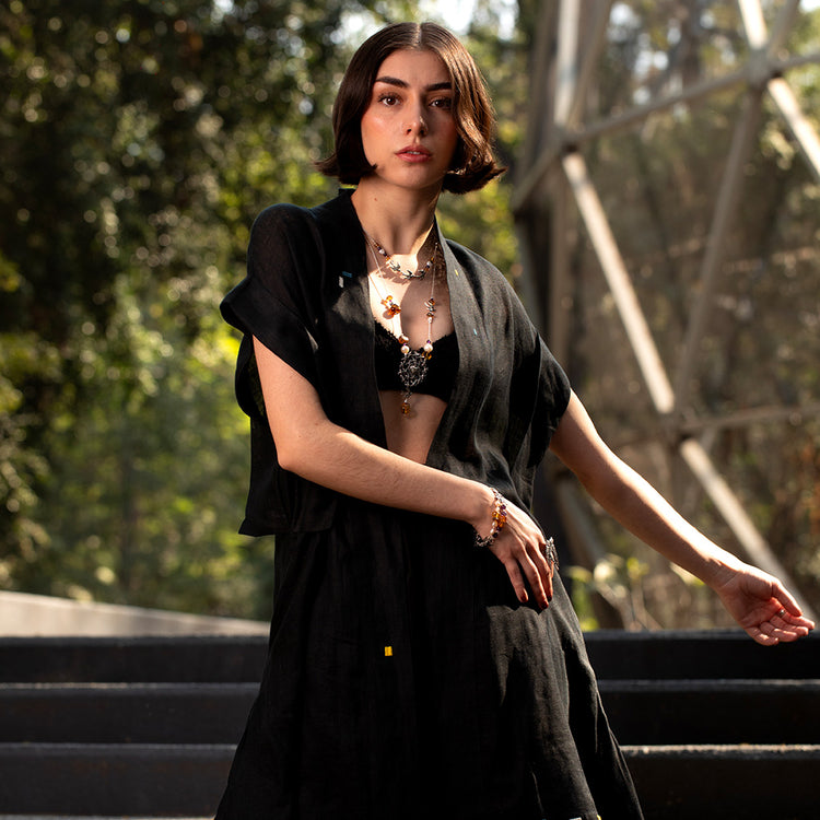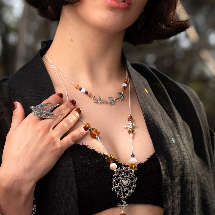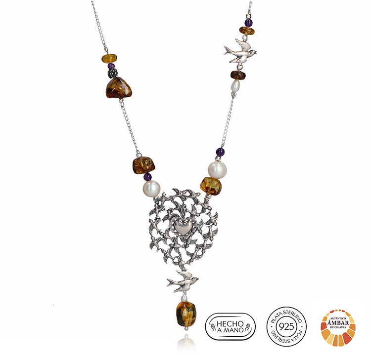 Gargantilla en plata .925, amatista natural, ámbar de Chiapas. Una parvada de golondrinas con un centro de corazón como símbolo de búsqueda compartida. Esta joya representa el impulso de volver al origen después del movimiento: el nido como espacio de cuidado, memoria y pertenencia. Un recordatorio de que regresar al corazón es también regresar a lo que nos da sentido.